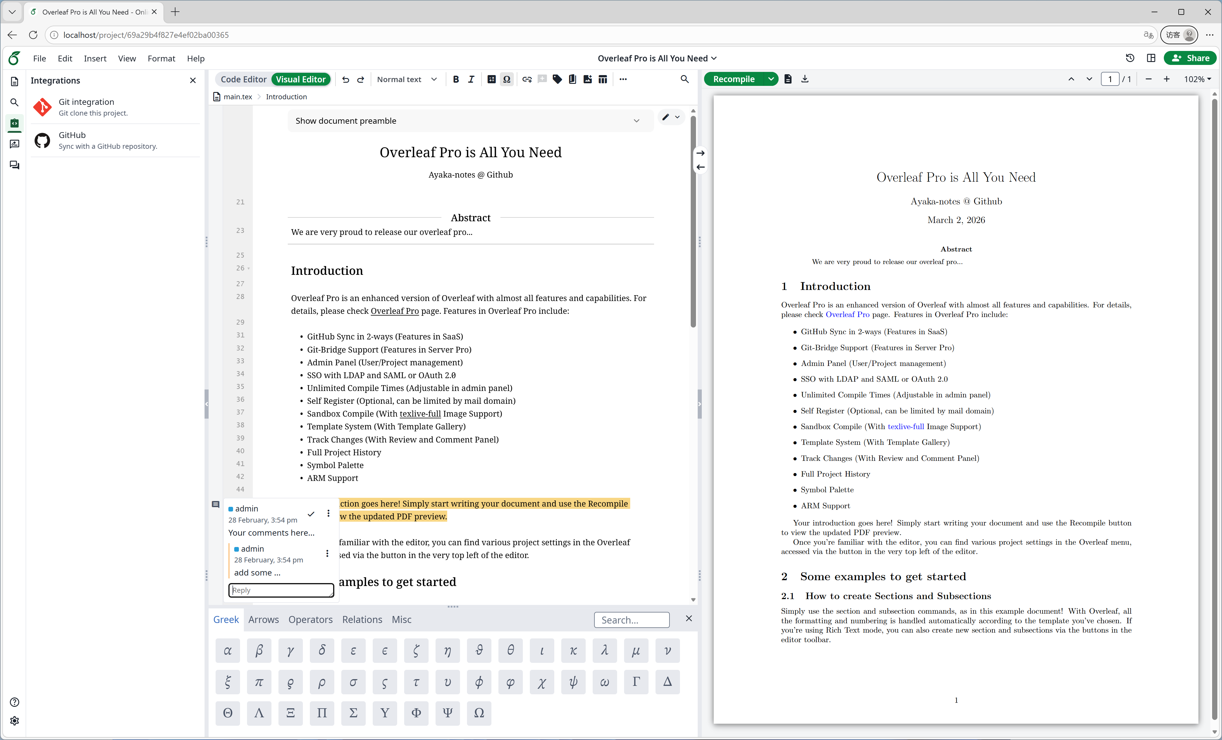 <p align="center">Write like a rocket scientist with Overleaf Pro<br>— <em><mark style="color:green;"><strong>unlock all Features</strong></mark></em>, an <em>on-Premise</em> solution that <em>anyone</em> can use.</p>